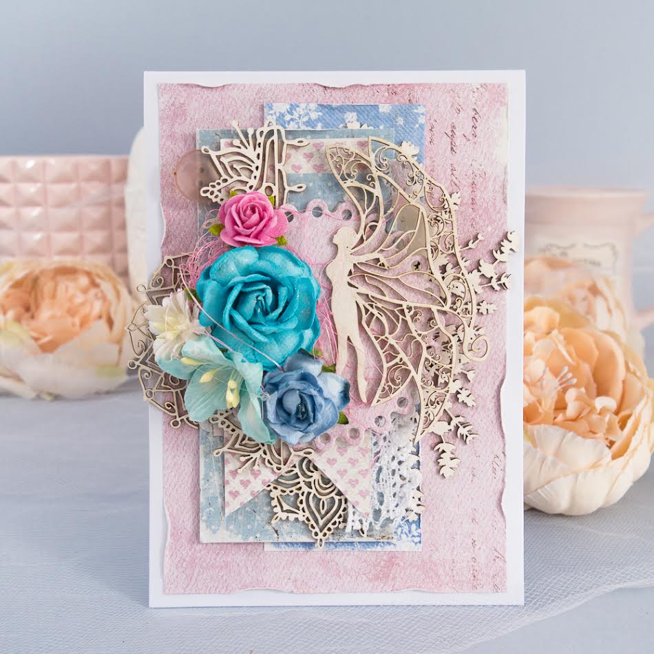 For Today I made two cards inspired by the magical world of Fairy's. What combines my projects is theme, colors and used material, but actually cards have different styles. I thought that it would be interesting to create different cards inspired by the same thing. My first card is very romantic and a little magical, with lots of layers, embellishments and a touch of shimmer. I used chipboards from couple collections: Lavender Mist, Lady Butterfly and Mahendi.